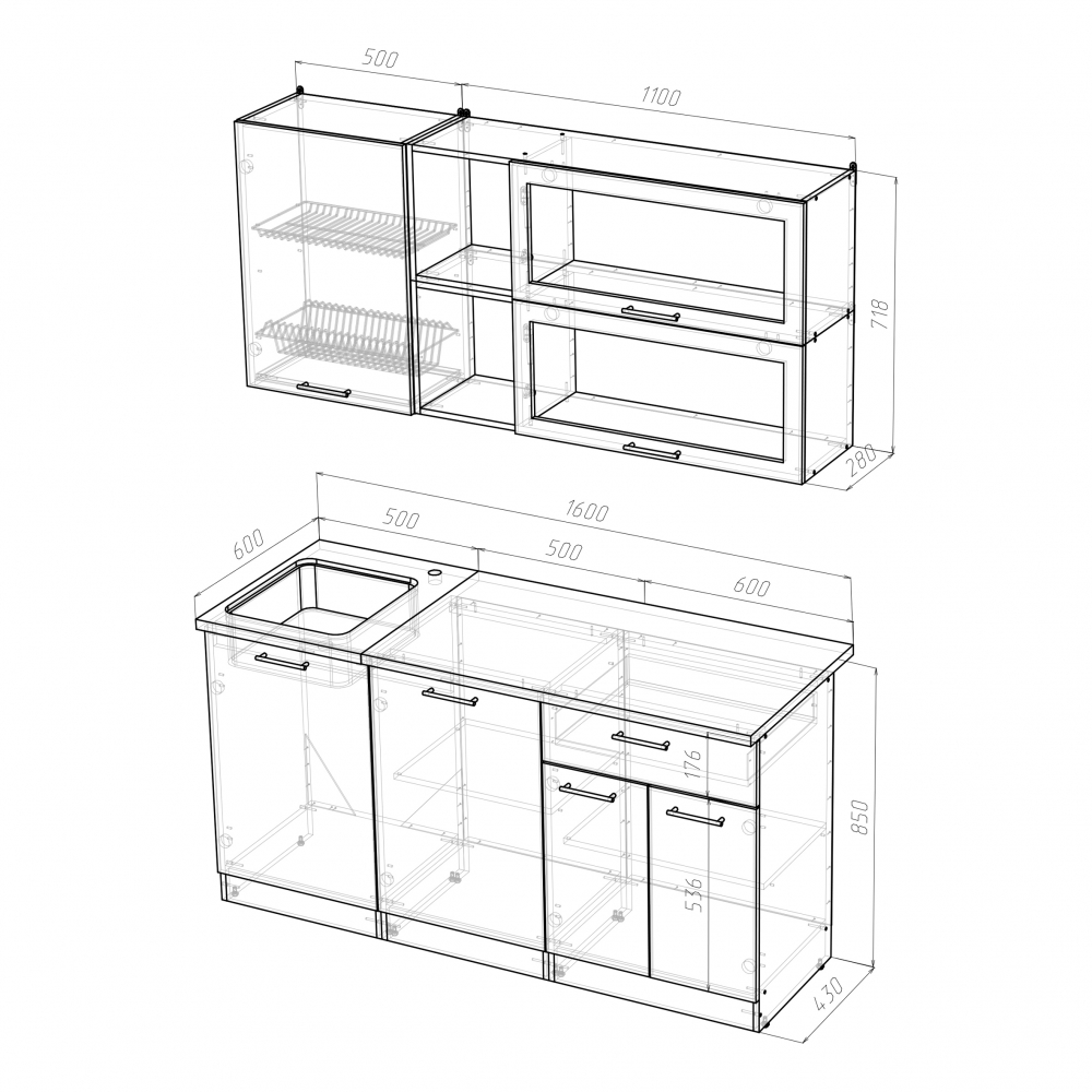 Ширина: 1600 мм; Глубина: 600 мм (со столешницей)