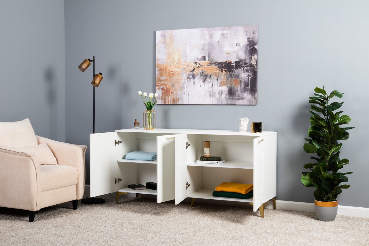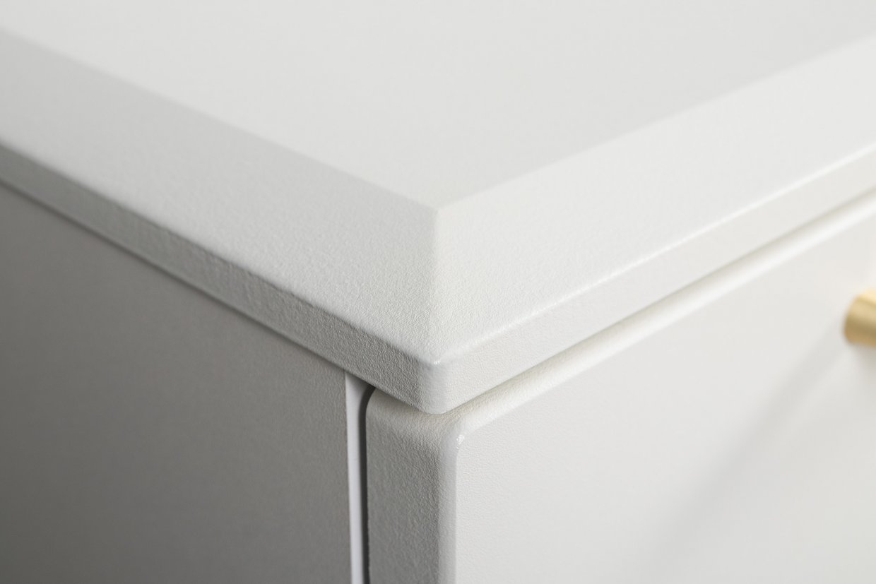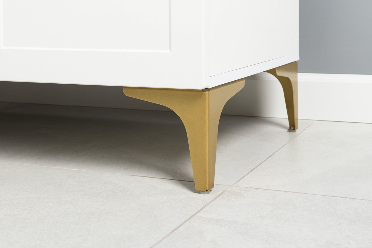 Фасады с фрезеровкой и верхняя крышка из МДФ сочетаются с металлическими ручками и опорами, создавая притягательный акцент в интерьере.